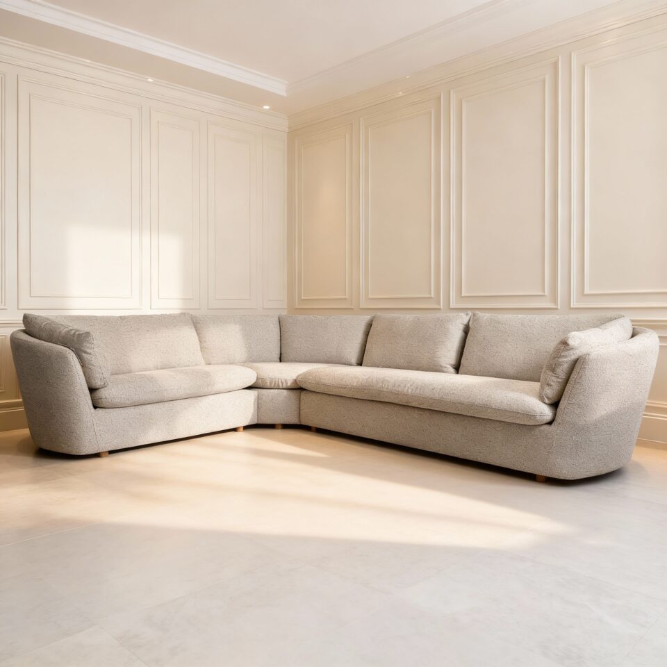 Its rounded arms, deep cushions and supportive back create a relaxed, cocooning feel, while the seamless low profile and smooth curves give the piece a refined, architectural silhouette. Generous proportions make it perfect for open-plan spaces, family living or creating a cosy, luxurious corner for everyday lounging.
