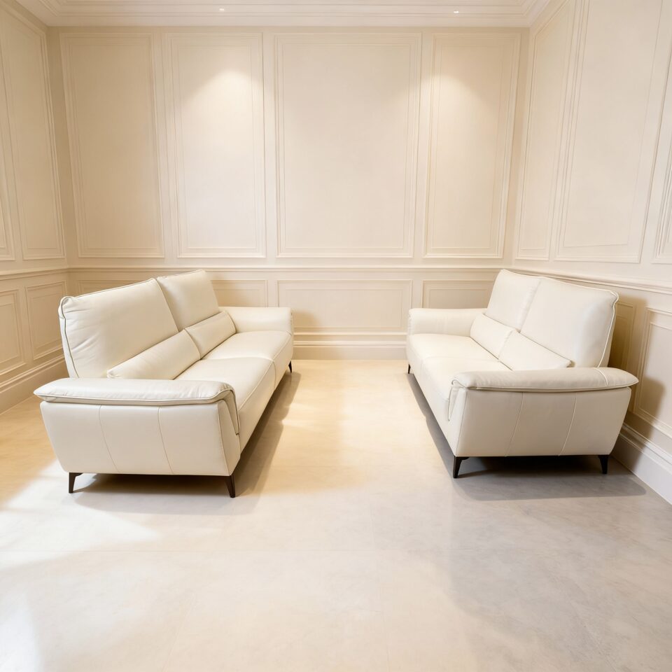 Beautifully upholstered in premium cream leather, this two- and three-seater sofa set combines classic Italian comfort with a sleek, contemporary silhouette. The smooth leather finish, refined stitching and tailored cushioning create an elegant, timeless look that elevates any living space.