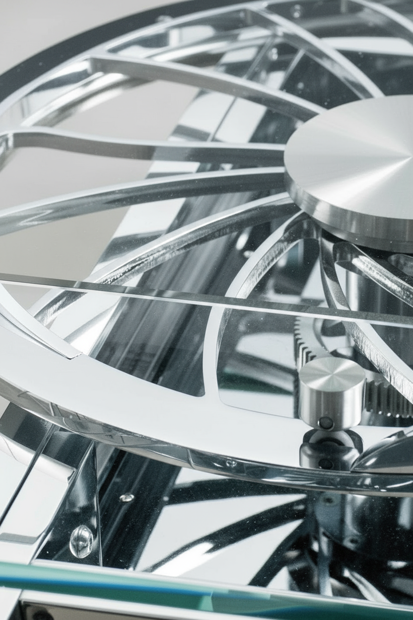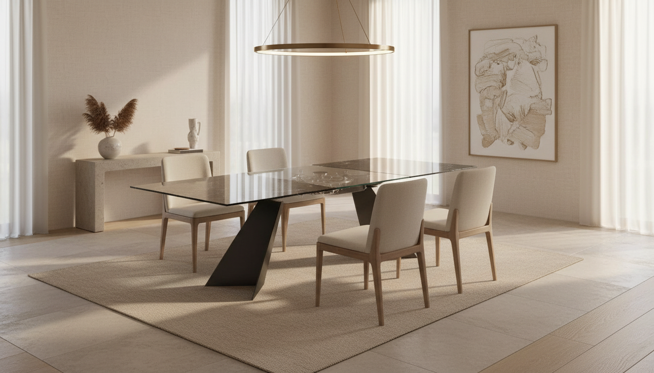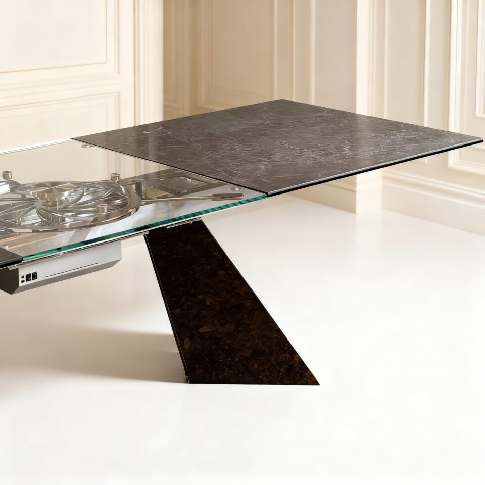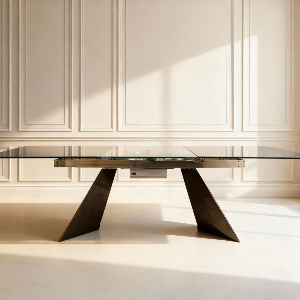 The Galax Extendable Dining Table by Naos is a statement of Italian innovation and refined engineering. Designed with Naos’ signature synchronised extension system, the table expands with a smooth, fluid motion: the central section lifts while the outer leaves glide outward in perfect alignment. The mechanism is a sculptural feature in itself, beautifully visible beneath the glass top.