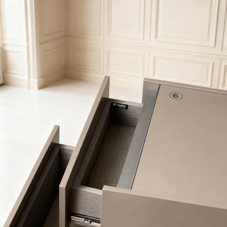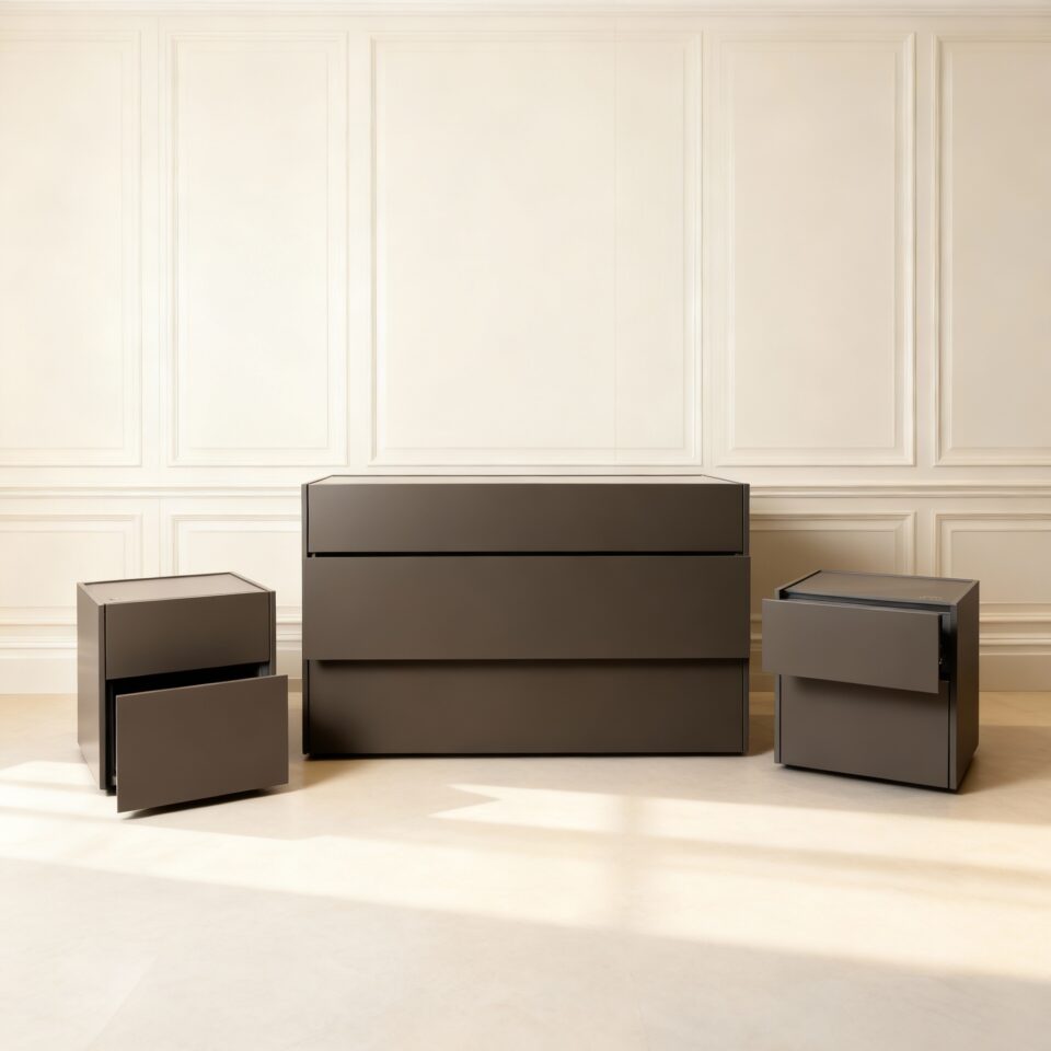 The set includes a generously proportioned three-drawer dresser and two matching bedside tables, each designed with soft-close runners and a luxurious linen-textured interior, a signature Alf DaFre detail that elevates the everyday. The drawers glide effortlessly, offering practical storage wrapped in premium Italian craftsmanship.