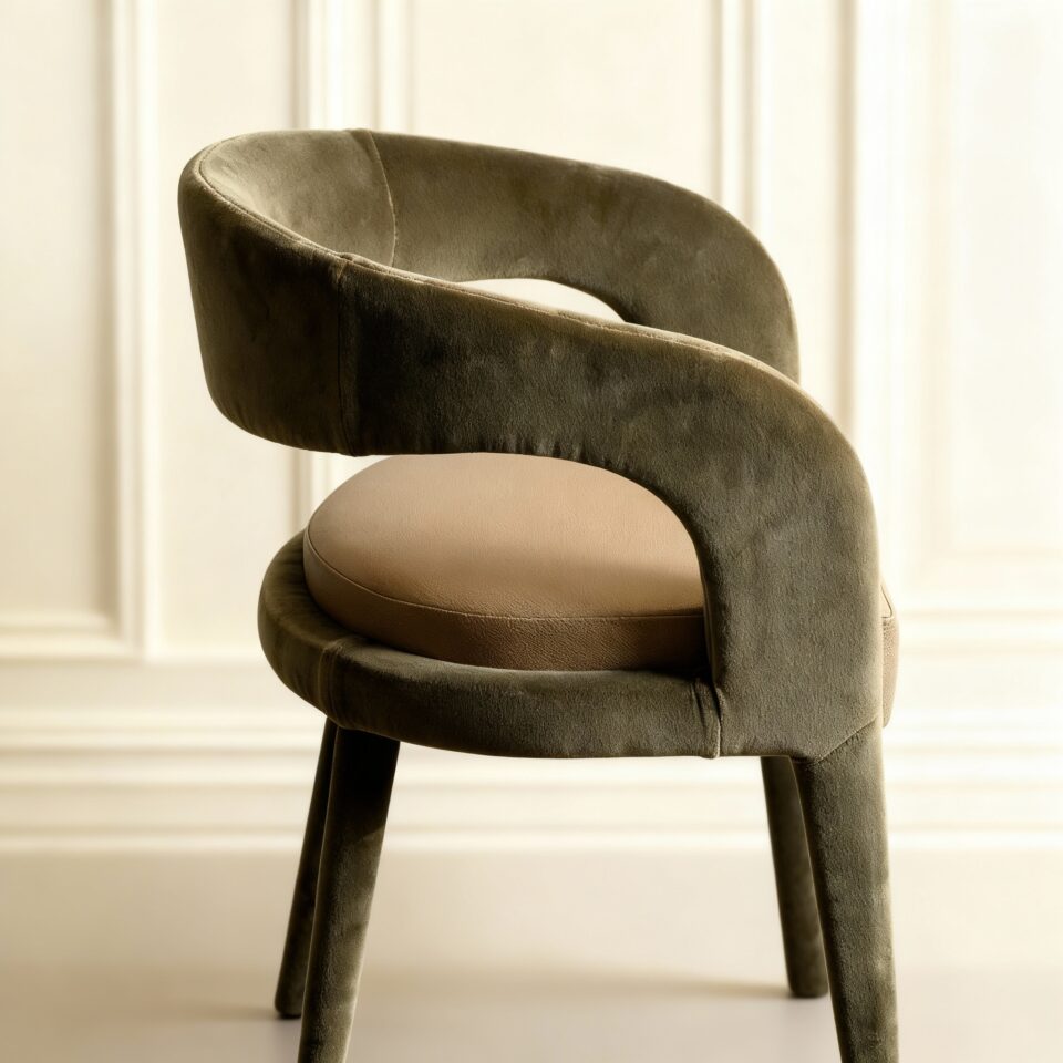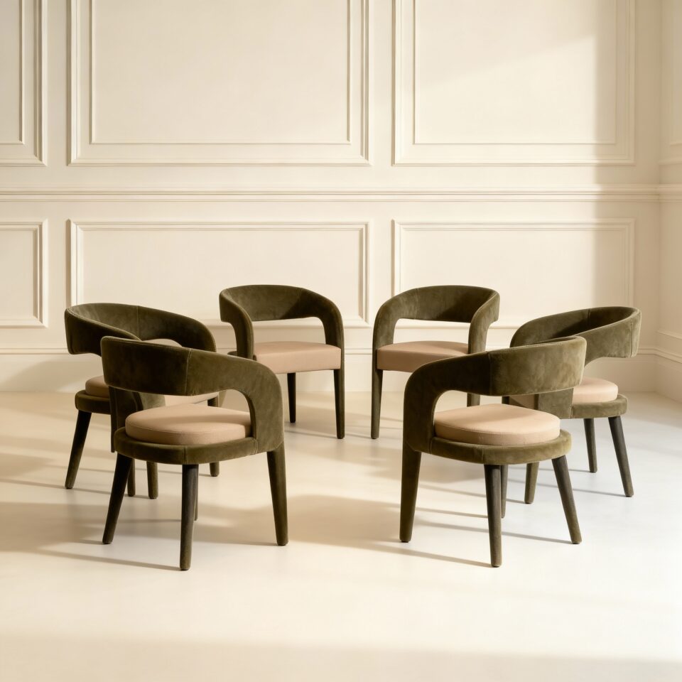 Upholstered in a beautifully soft deep olive velvet, this set of six contemporary dining chairs brings warmth, elegance and sculptural form to any dining space. The wrap-around backrest creates a refined, cocoon-like shape, offering comfortable support while maintaining a sleek, modern silhouette.