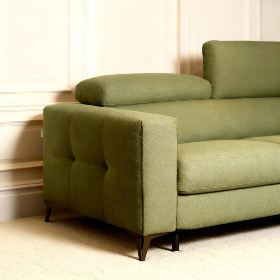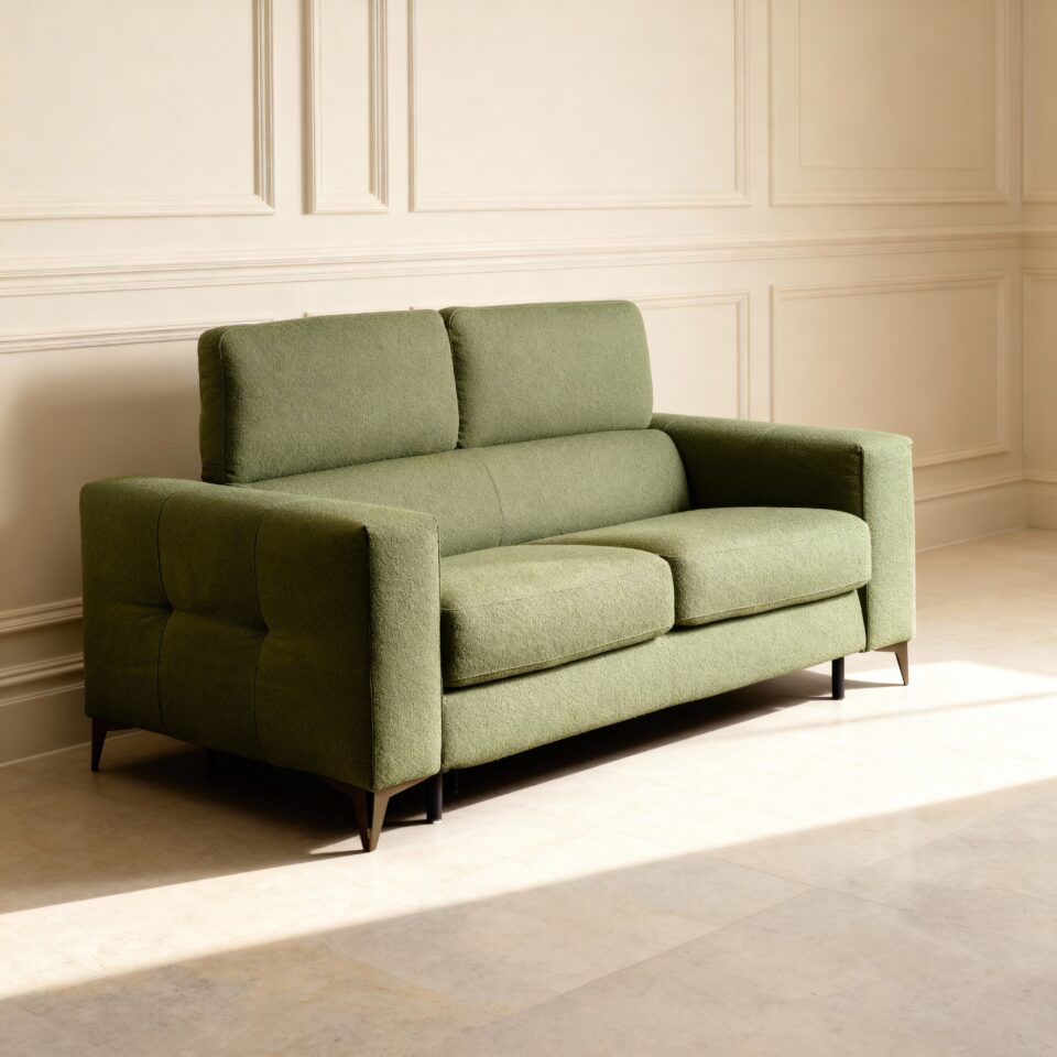 Refined versatility meets Italian practicality in this beautifully designed sofabed, the perfect blend of everyday comfort and effortless functionality. Upholstered in a soft sage green textured fabric, the piece feels calm, inviting and contemporary, while the clean lines and tailored silhouette keep it looking elegant from every angle.