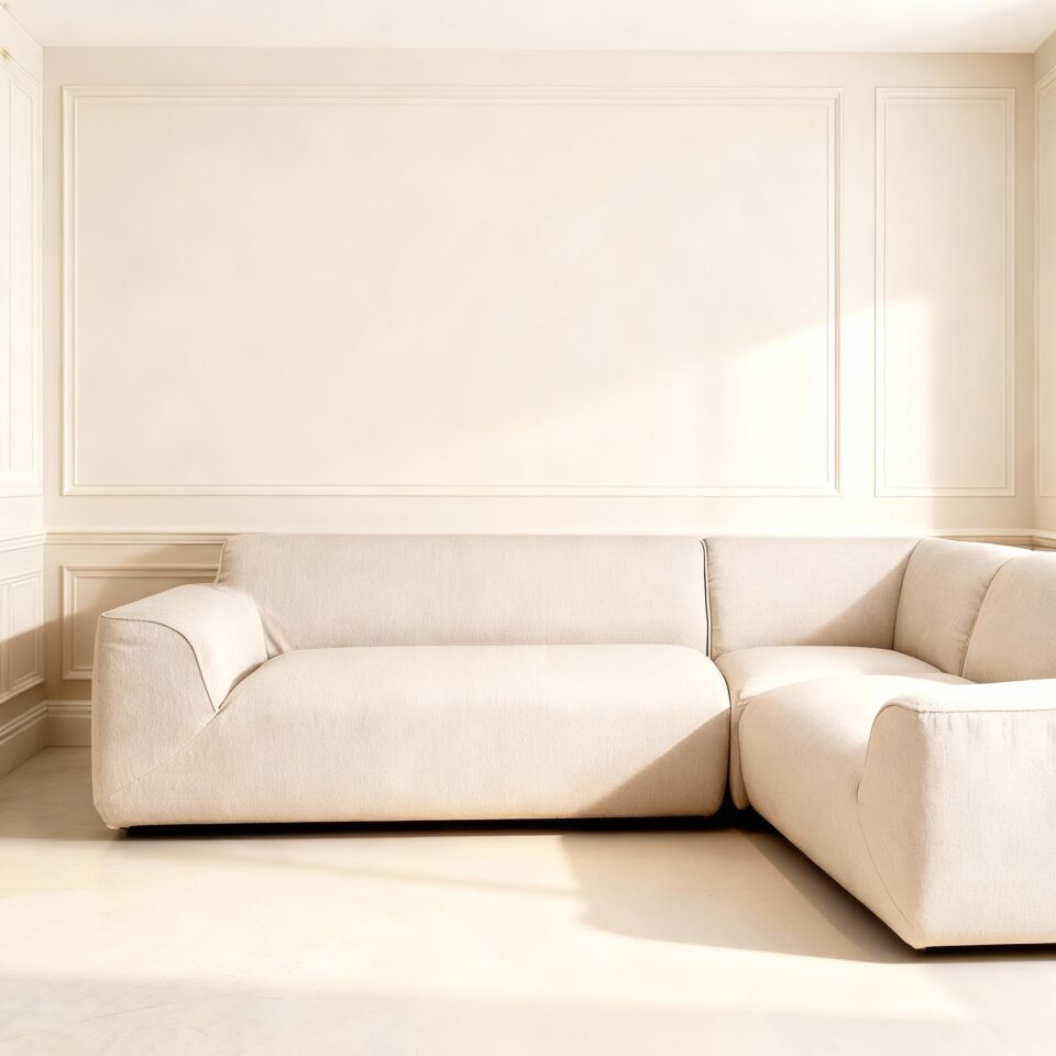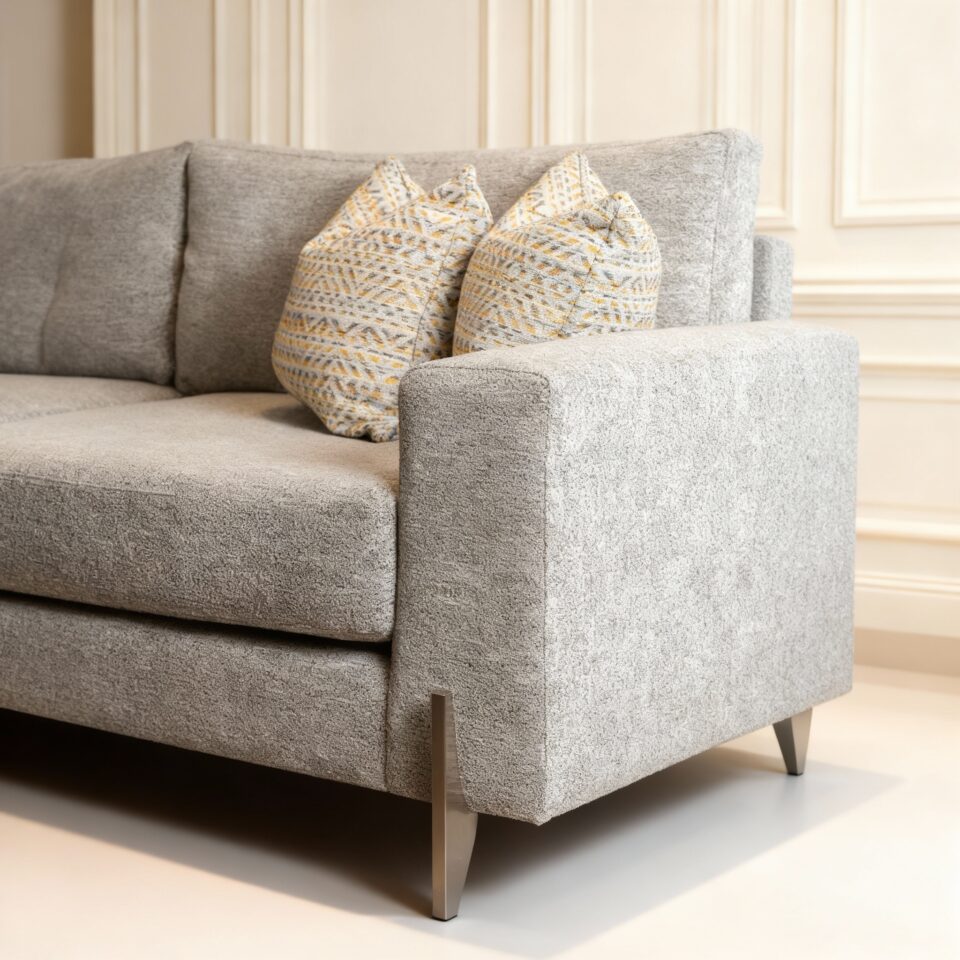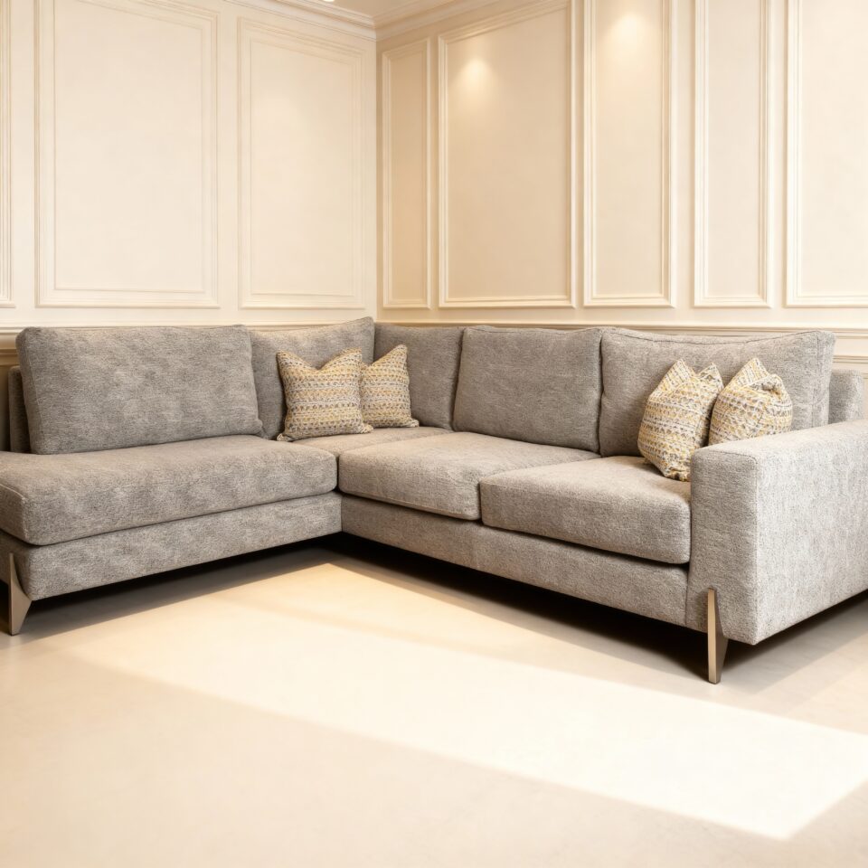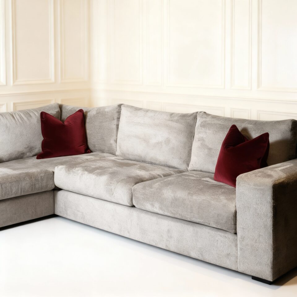 Crafted in-house by QLS, this contemporary corner sofa combines generous comfort with a beautifully refined silhouette. Upholstered in a soft taupe-grey plush textured fabric, it brings warmth, depth and a calm, modern elegance to any interior.