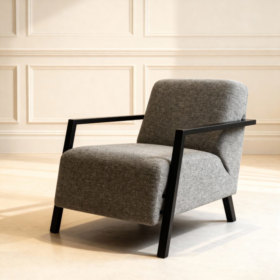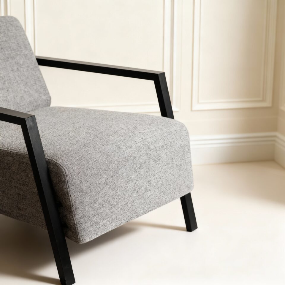 Upholstered here in a soft grey textured fabric, the chair offers a calm, understated look that blends effortlessly into any interior. The slim, solid-wood frame brings structure and contrast, giving the piece a refined architectural quality.