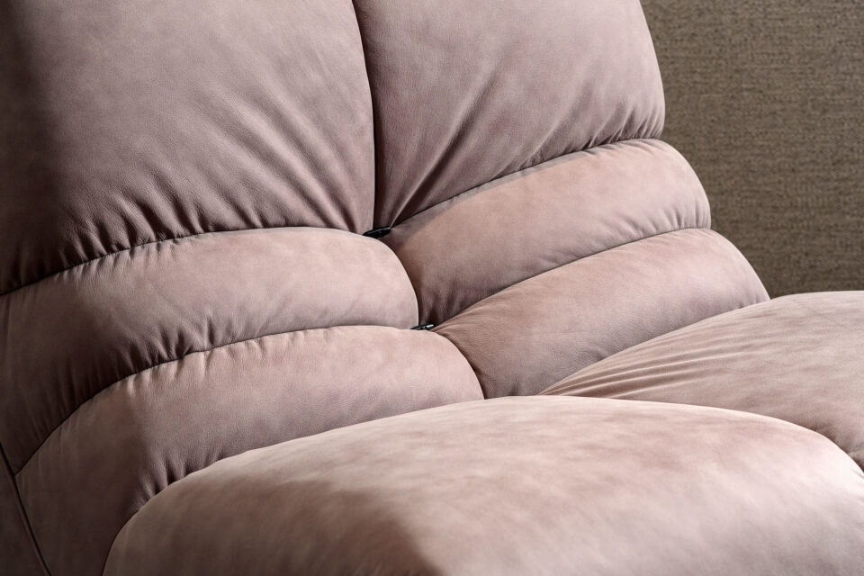 The chair features subtle button-style stitched details that draw the leather into softly gathered sections, adding texture, craftsmanship and gentle visual interest. These tailored pulls give the piece structure without compromising its relaxed, cloud-like silhouette.