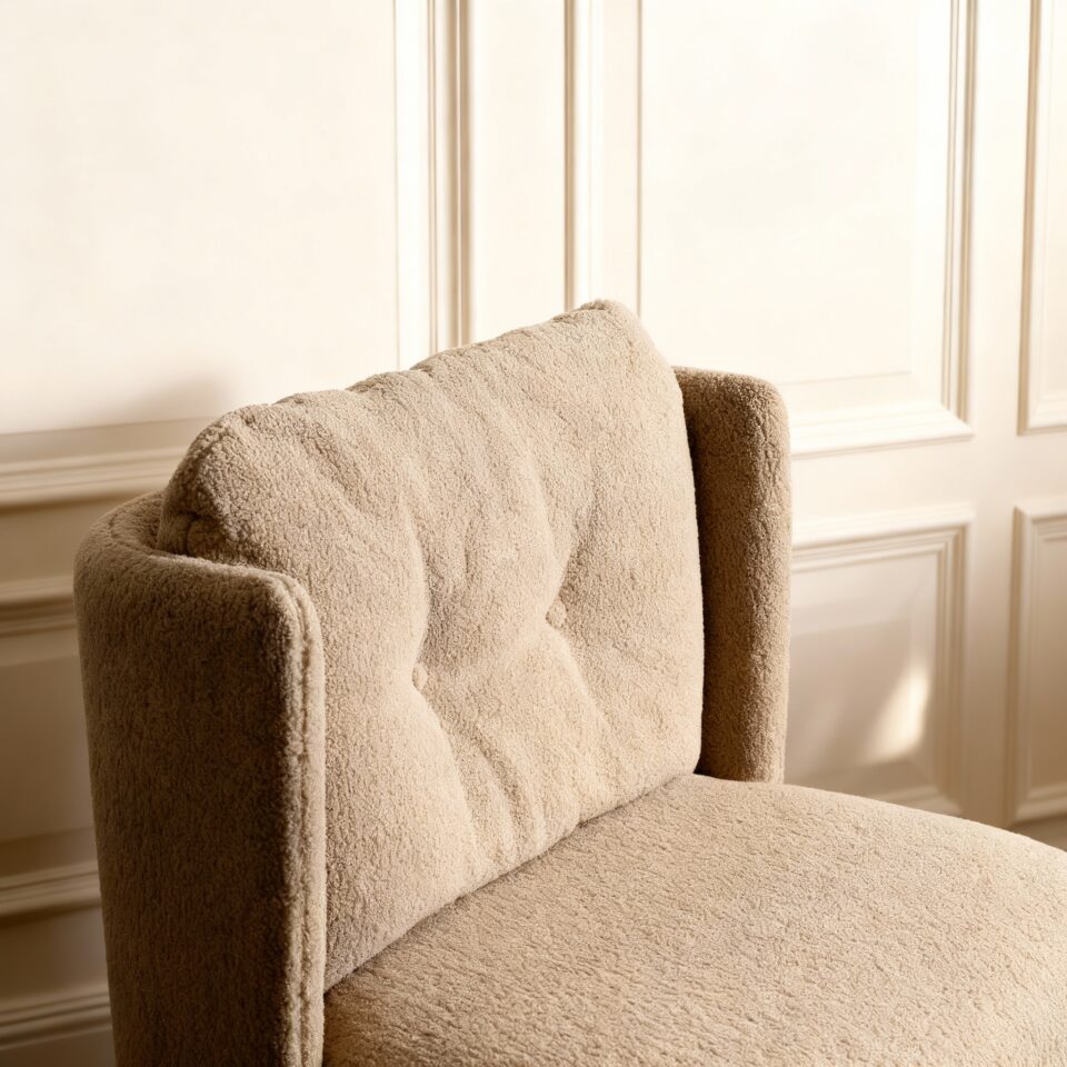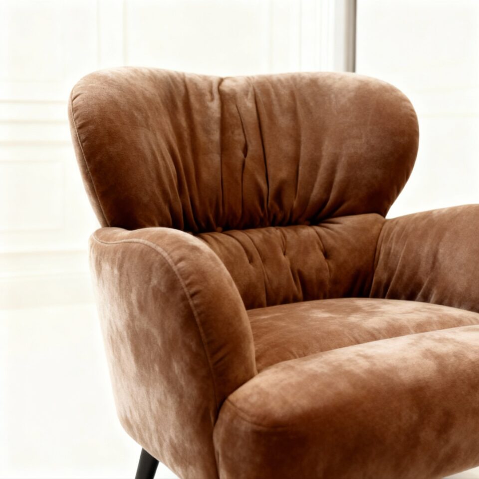 The backrest features subtle button-style tufting, introducing a delicate handcrafted detail that enhances the overall softness and visual interest of the chair. With its compact proportions and clean lines, it works beautifully as an accent chair in living rooms, bedrooms or reading corners.