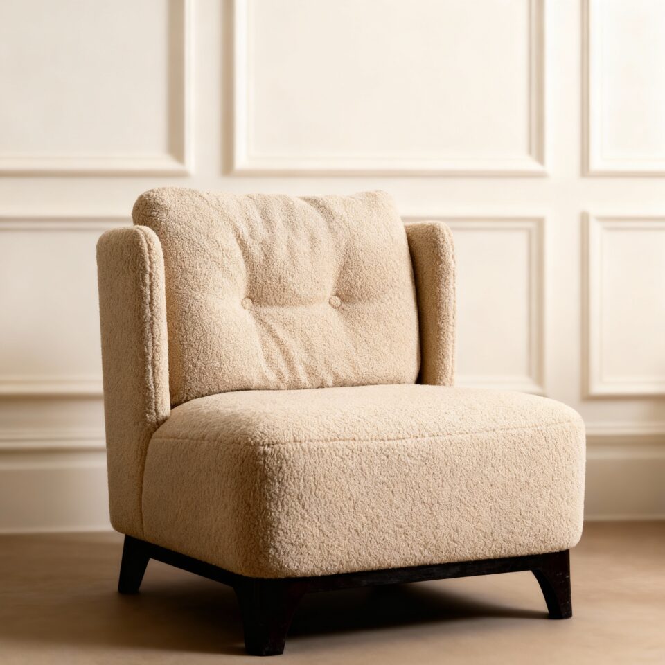 Upholstered in a soft cream textured fabric, this contemporary armchair brings warmth, comfort and gentle sophistication to any interior. The plush boucle-style surface adds depth and a tactile, inviting feel, while the curved silhouette and padded form create a relaxed, cocooning seat perfect for everyday lounging.