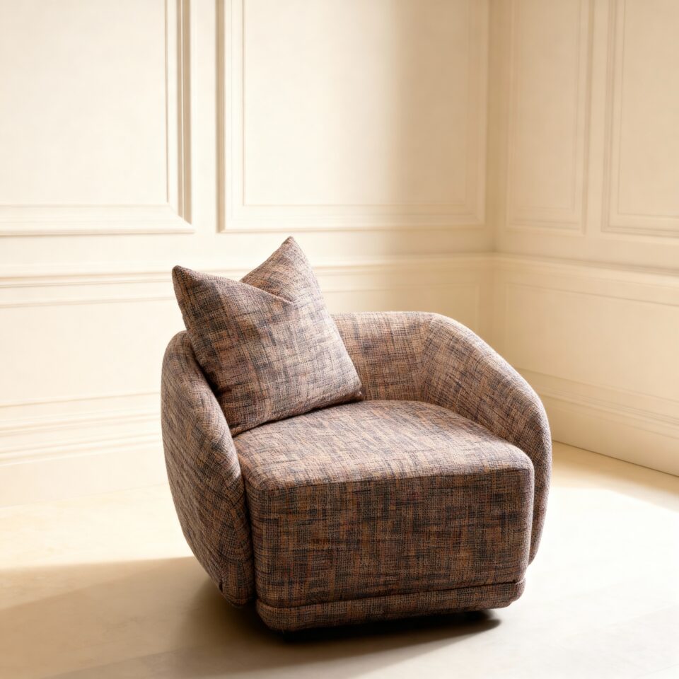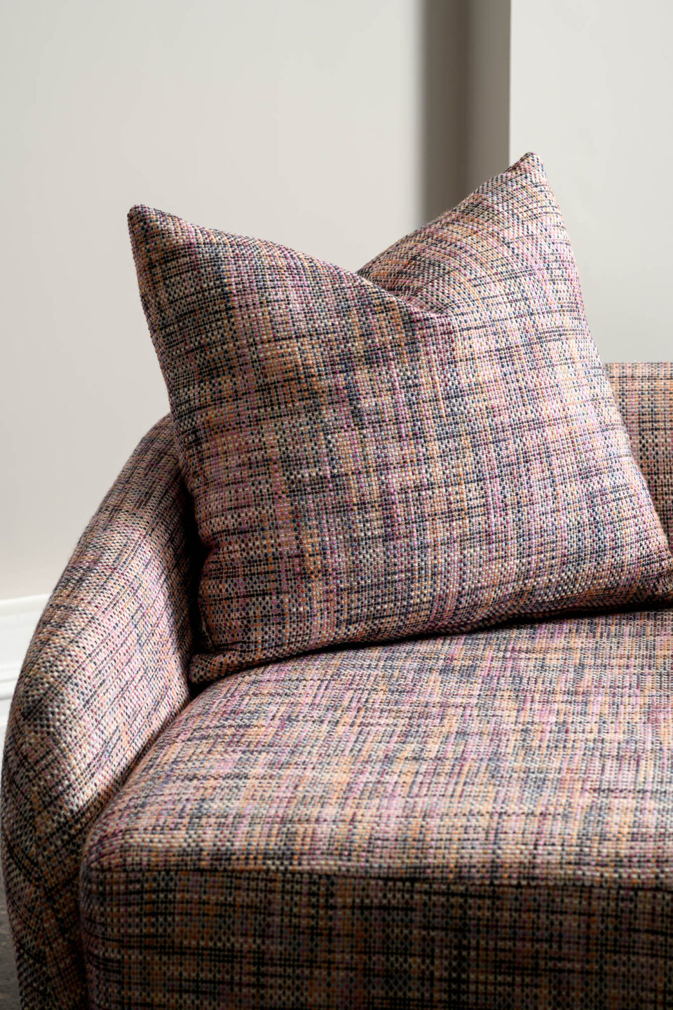 Handcrafted with a beautifully textured multicoloured woven upholstery, Siena brings depth, warmth and quiet sophistication to any interior. The fabric blends soft tones of blush, charcoal, amber and muted neutrals, creating a subtle, heathered effect that feels both modern and timeless. Its tactile, soft tweed-inspired weave adds gentle visual movement, giving the piece richness without overwhelming a space.