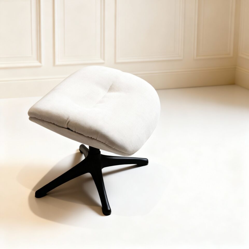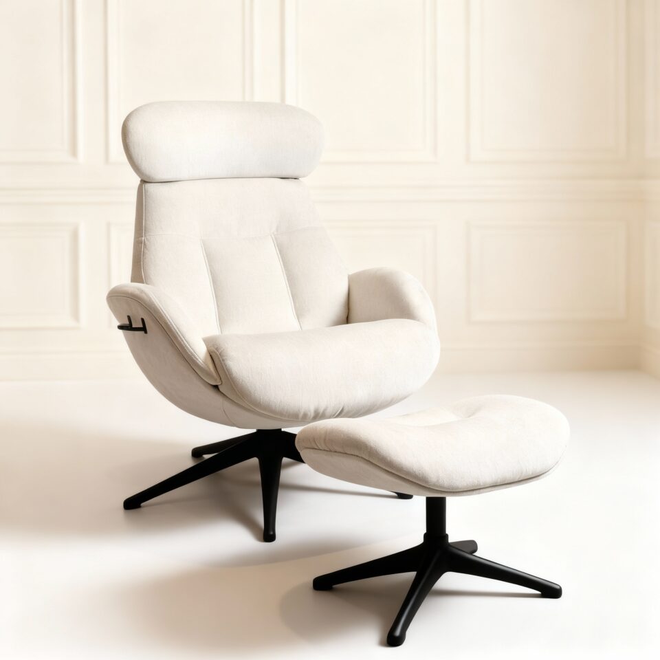 The chair features a subtle recline mechanism for added comfort, paired with a matching footstool designed to support the legs and enhance full-body ease. Its black star-base frame adds a crisp contemporary contrast to the soft cream upholstery, giving the piece a timeless, minimalist appeal.