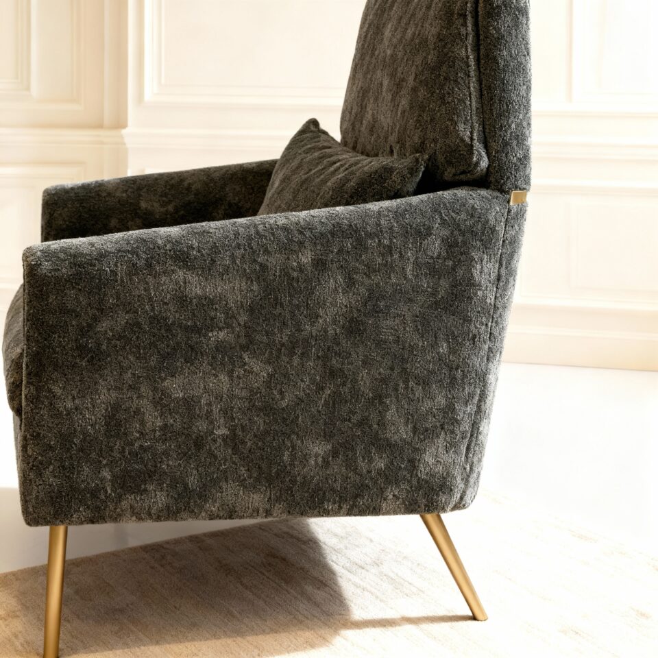 Upholstered in a rich charcoal plush textured fabric, this armchair brings depth, warmth and modern elegance to any interior. The fabric has a soft, velvety hand-feel with subtle tonal variation, giving it a luxurious, inviting look that catches the light beautifully. Comfortable, tactile and refined, it adds quiet sophistication without overwhelming a space.
