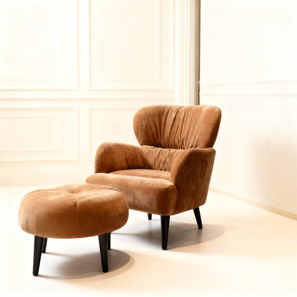 With its sculpted backrest, supportive seat and rounded arm profile, the chair offers deep comfort without compromising on style. The matching footstool completes the set, creating the perfect spot for relaxing, reading or unwinding after a long day. Set on refined dark timber legs, the silhouette feels timeless and effortlessly sophisticated.