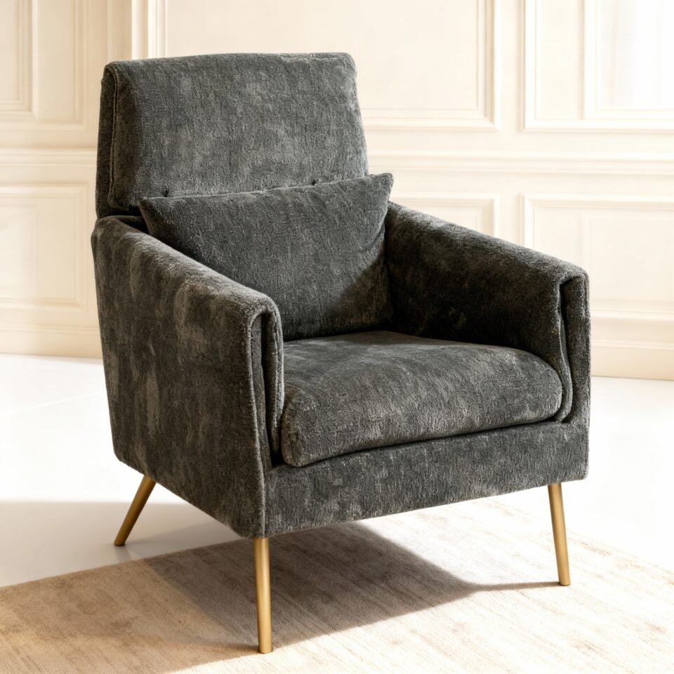 The sculpted silhouette is complemented by a generously cushioned seat and a matching lumbar pillow, offering both style and support. Set on sleek tapered brass-finish legs, the piece feels contemporary yet timeless,ideal for a refined living room, a calm reading nook or a stylish bedroom corner.